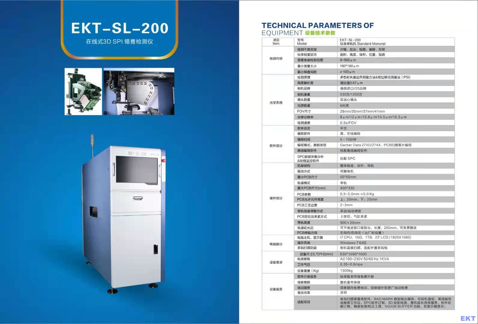 SPI銷(xiāo)售專(zhuān)線(xiàn):13714289164(微信同號(hào))雷小姐 深圳易科訊科技有限公司(EKT)成立于2006年,注冊(cè)資金:人民幣1000萬(wàn)。是一家專(zhuān)業(yè)從事SMT表面貼裝行業(yè)的視覺(jué)光學(xué)檢測(cè)的AOI及3D SPI錫膏測(cè)厚儀自動(dòng)化檢測(cè)設(shè)備自主研發(fā)設(shè)計(jì)、生產(chǎn)、銷(xiāo)售與售后服務(wù)的方案制造生產(chǎn)商。主要產(chǎn)品為AOI自動(dòng)光學(xué)檢測(cè)儀、包括:(在線(xiàn)式AOI.離線(xiàn)式AOI、在線(xiàn)雙軌AOI、上下雙面檢在線(xiàn)AOI光學(xué)檢測(cè)儀、加大尺寸非標(biāo)訂制AOI及3DSPI錫膏厚度測(cè)試儀設(shè)備等) 自動(dòng)錫渣還原機(jī)(SRS)、馬達(dá)自動(dòng)測(cè)試儀及SMT周邊輔助產(chǎn)品。EKT設(shè)備行銷(xiāo)歐美及東南亞國(guó)家,并贏(yíng)得良好聲譽(yù)。EKT易科訊秉承以人為本的人文精神,信奉誠(chéng)信、創(chuàng)新、專(zhuān)業(yè)、精致的生存和發(fā)展。
